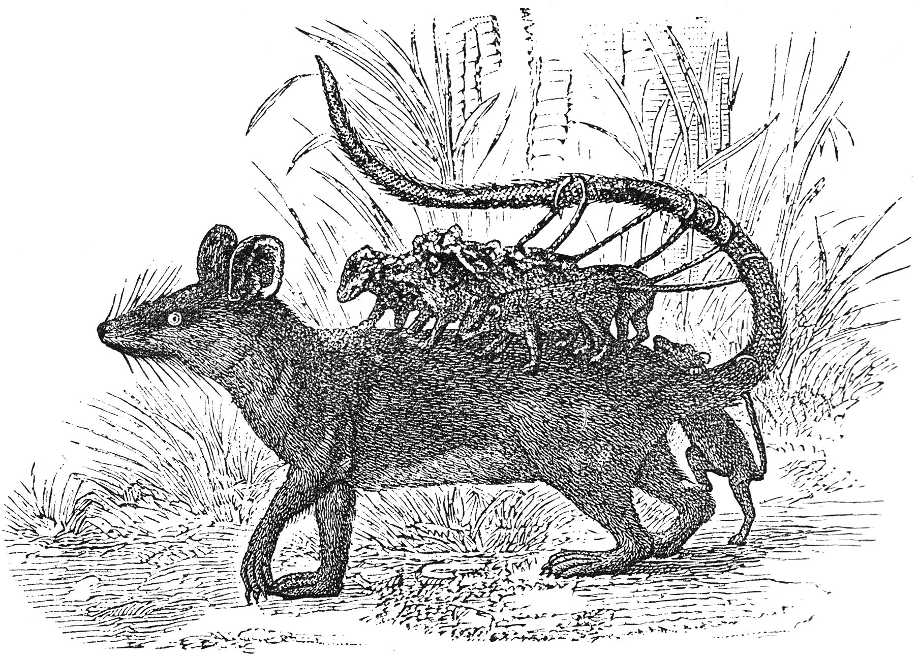 And Geddes illustrates this with a steel engraving of six baby opossums being taken out for a walk by their mother, hanging on by their tails.