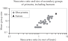 This correlation is trickier than it may seem. Since the neocortex is the part of the brain that can process the politics of multiple interactions, the large neocortex ratio is needed to understand and deal with the complex relationships in the small group. Clear enough so far, but Dunbar argues that the larger the small/primary group you belong to, the larger the secondary group you can make your way in, which is why the neocortex ratio is associated with both group sizes. If you have the benefit of belonging to a relatively large, closely-bonded primary group of friends and allies, this power base makes it possible for you to survive and prosper in a relatively large secondary group: if you are on your own in a troupe of gelada baboons or in a neighbourhood of human primates, it is hard for you to defend your interests. A primary group of close friends puts you in a tenable position in the secondary group/troupe/neighbourhood.